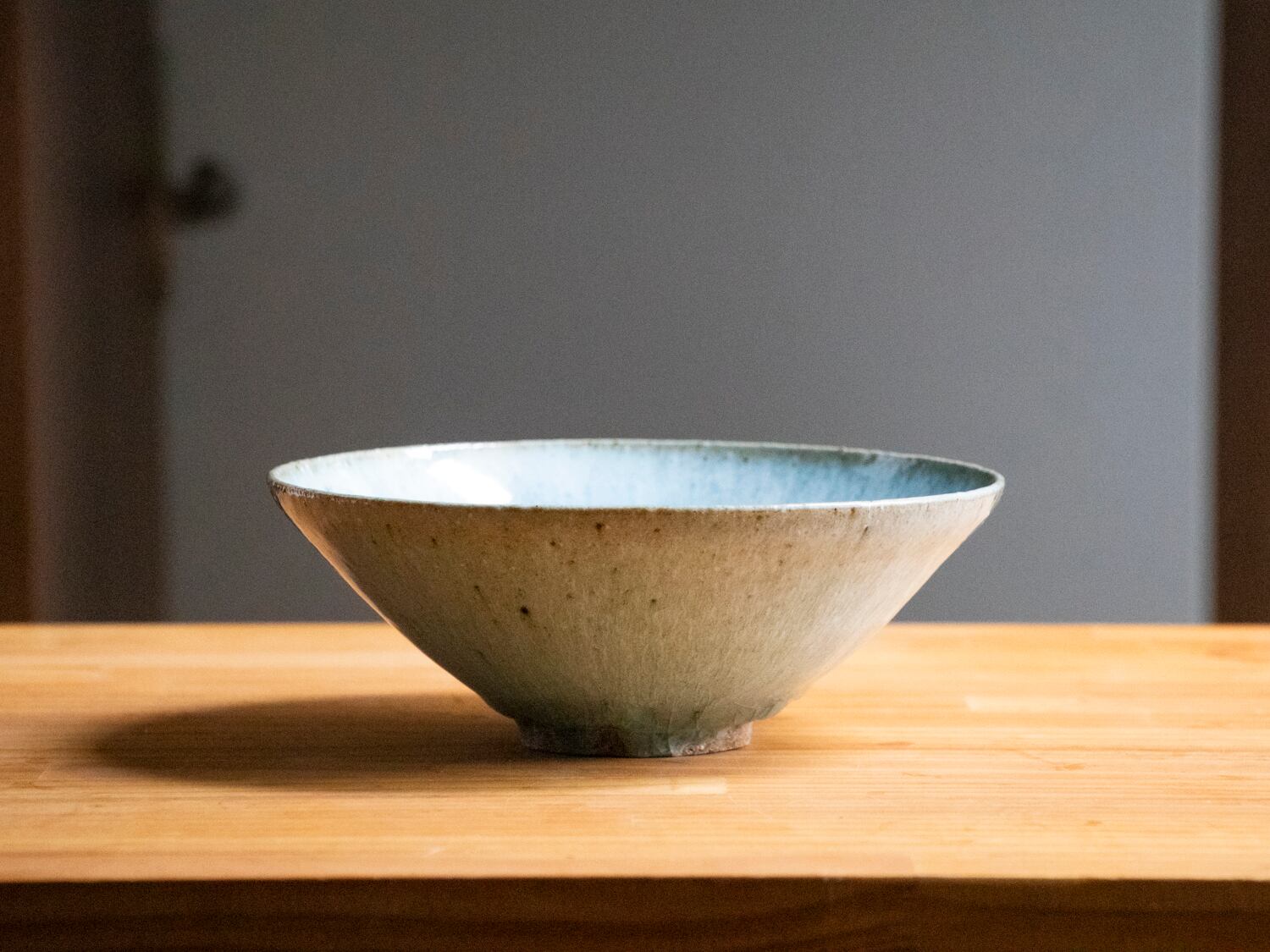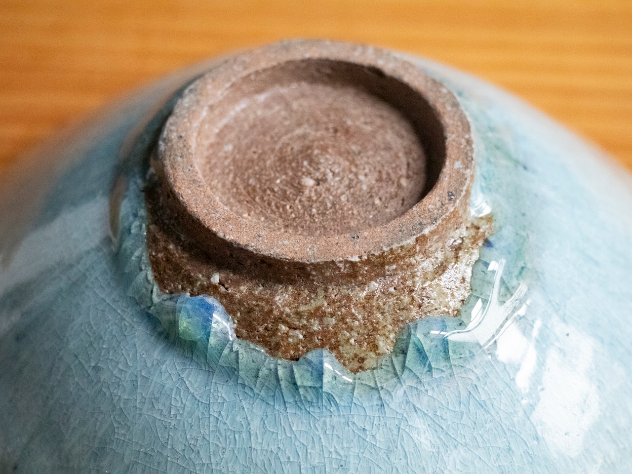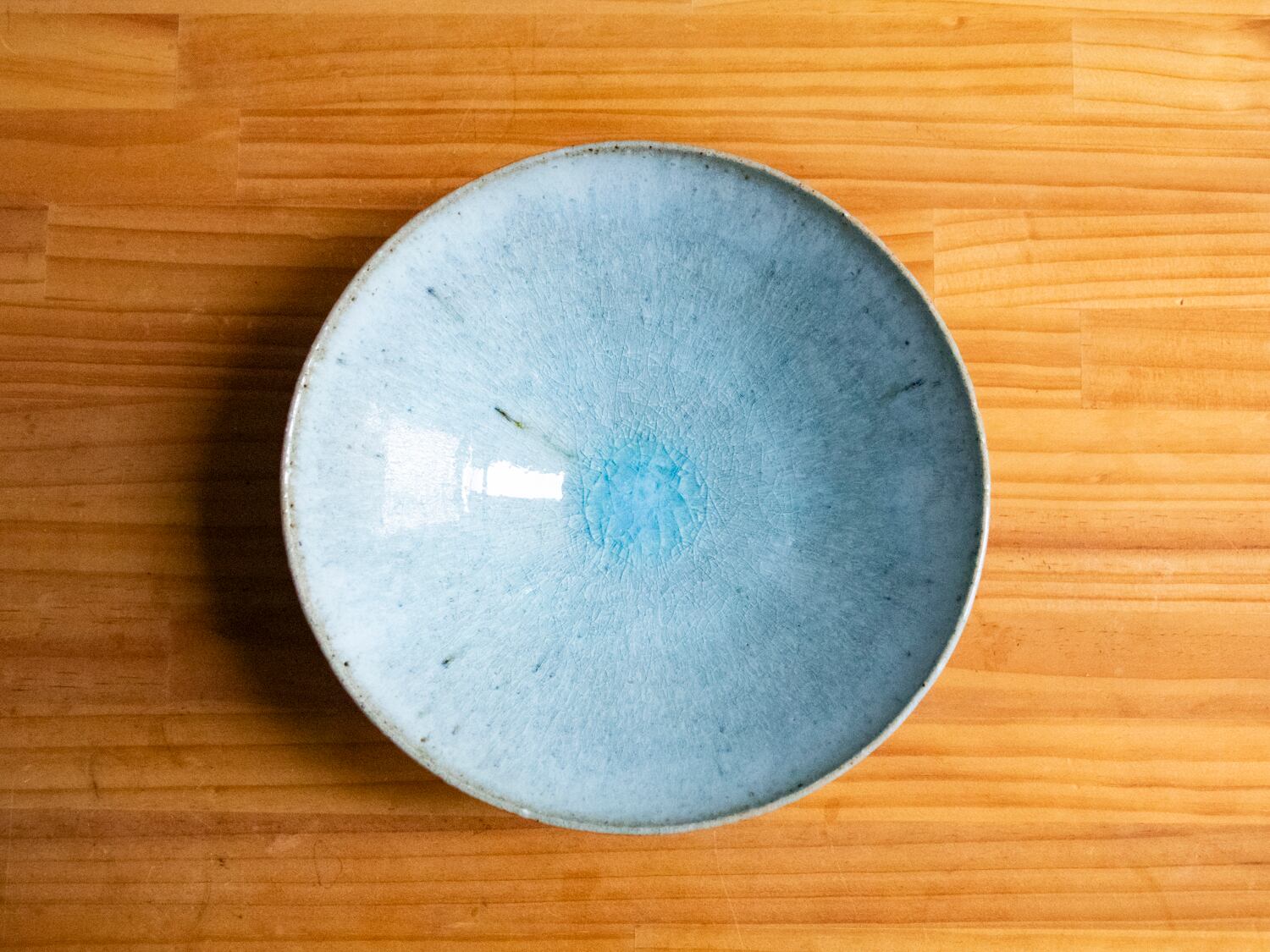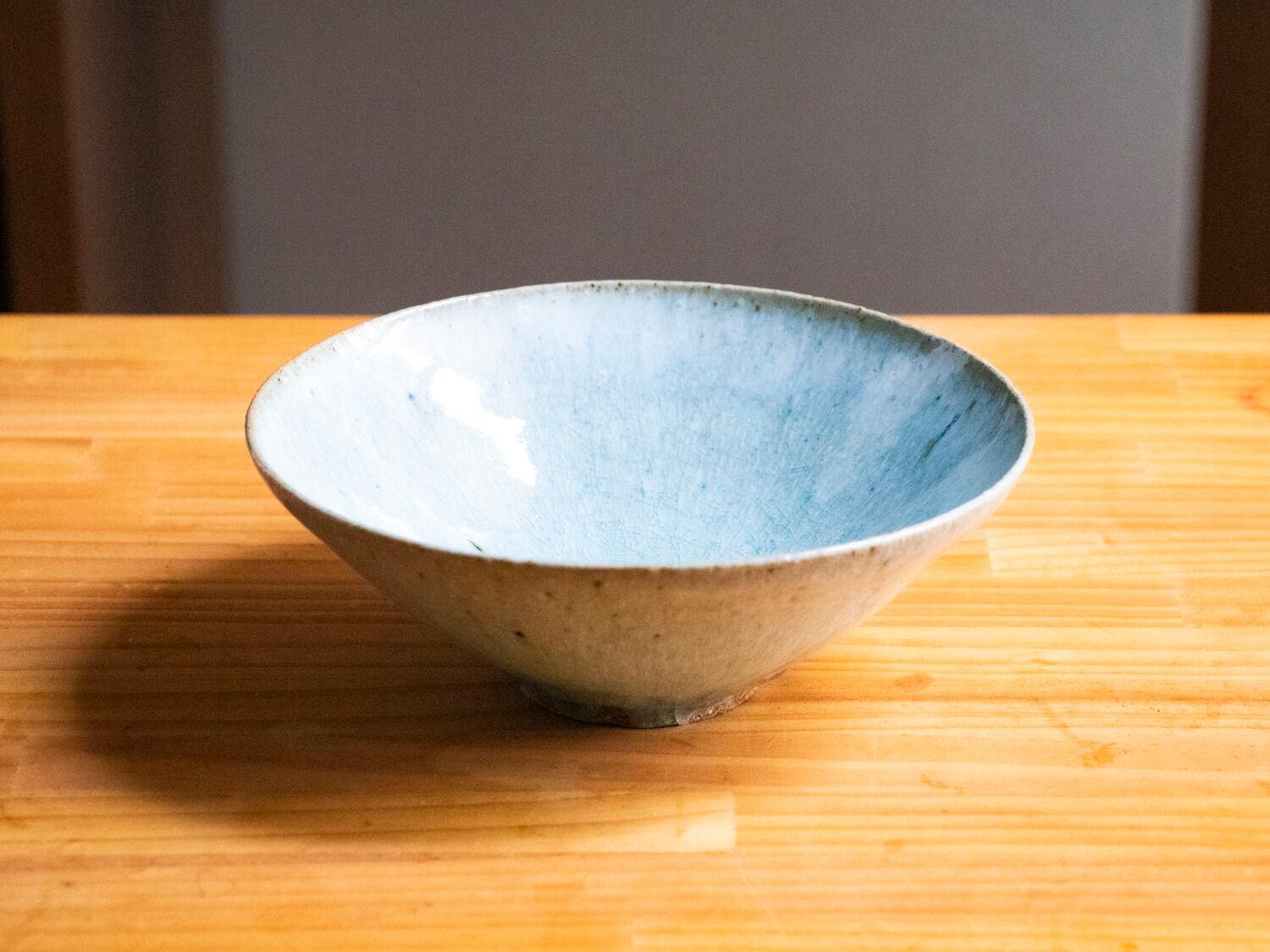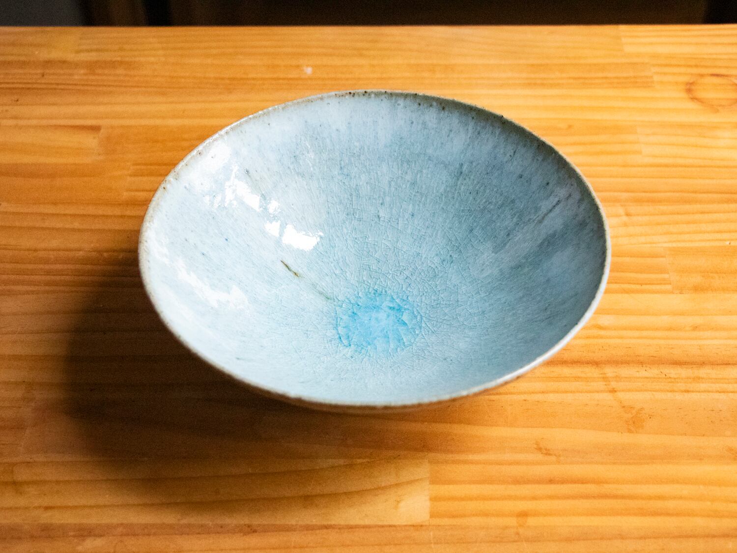 青白流し(せいはくながし)の丼ですね。青白流しはワラの釉薬と透明の釉薬を高温で焼いて、釉薬が器を流れるように融かして景色を作る技法です。春から夏の食卓に似合いそうな色ですね。