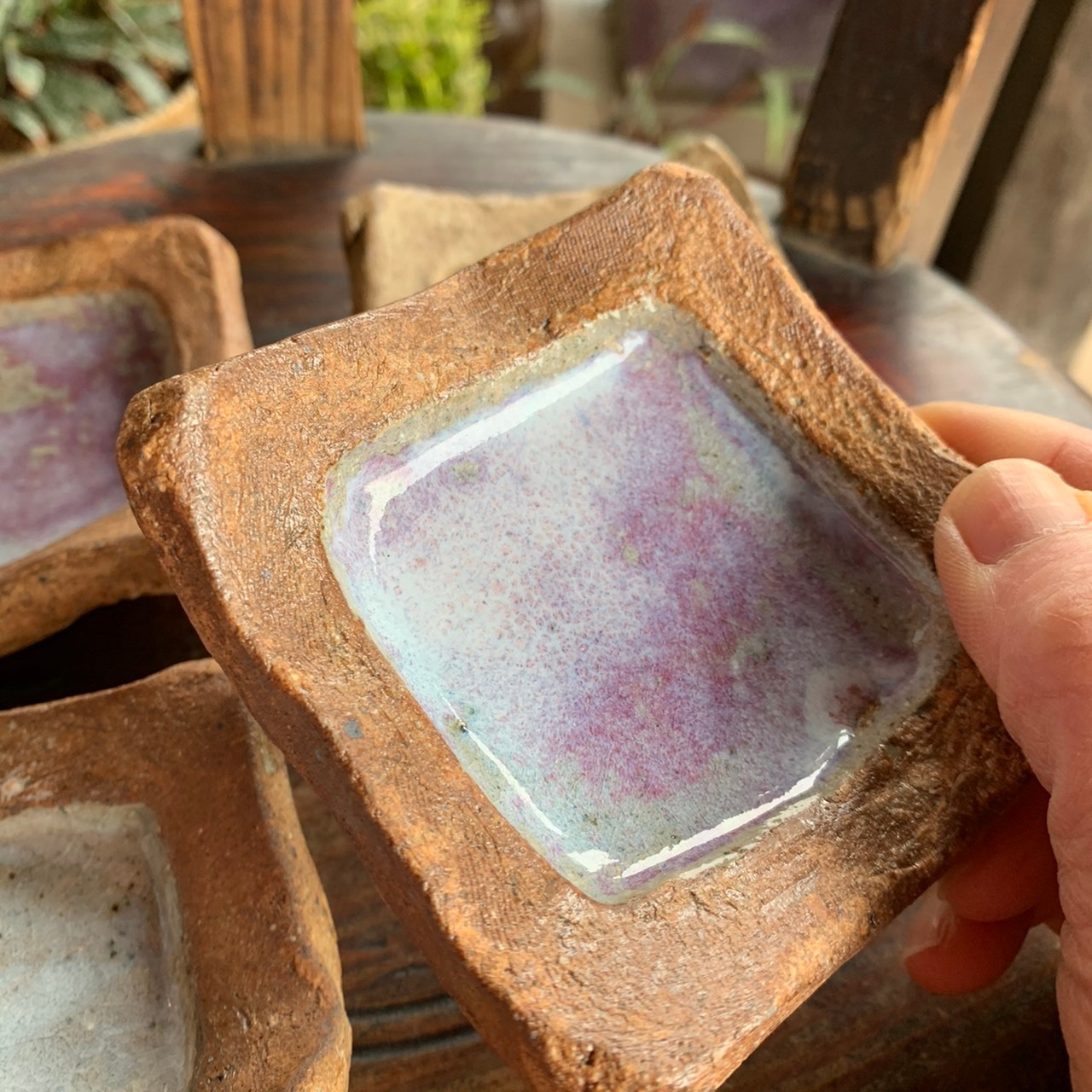 粗く生成した土に、表情を出すために色違いの土を塗り込んで、一度 高温焼成することで2種類の土が溶け合って、自然石のような状態に近づけてから、もう一度釉薬をかけて焼いています。
