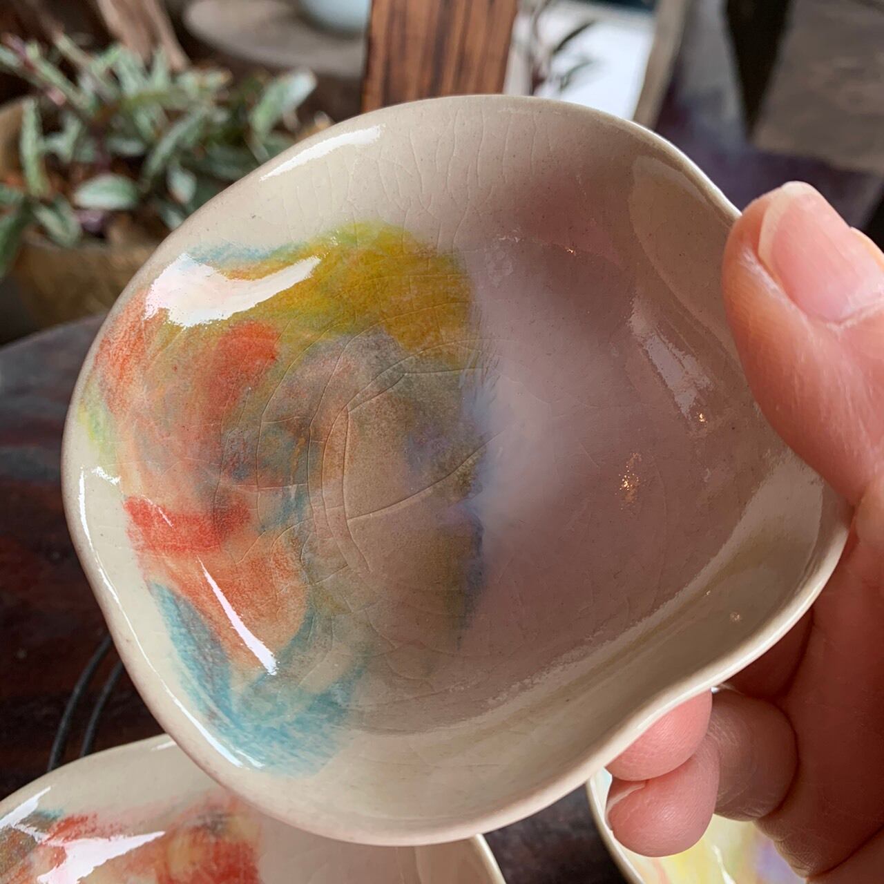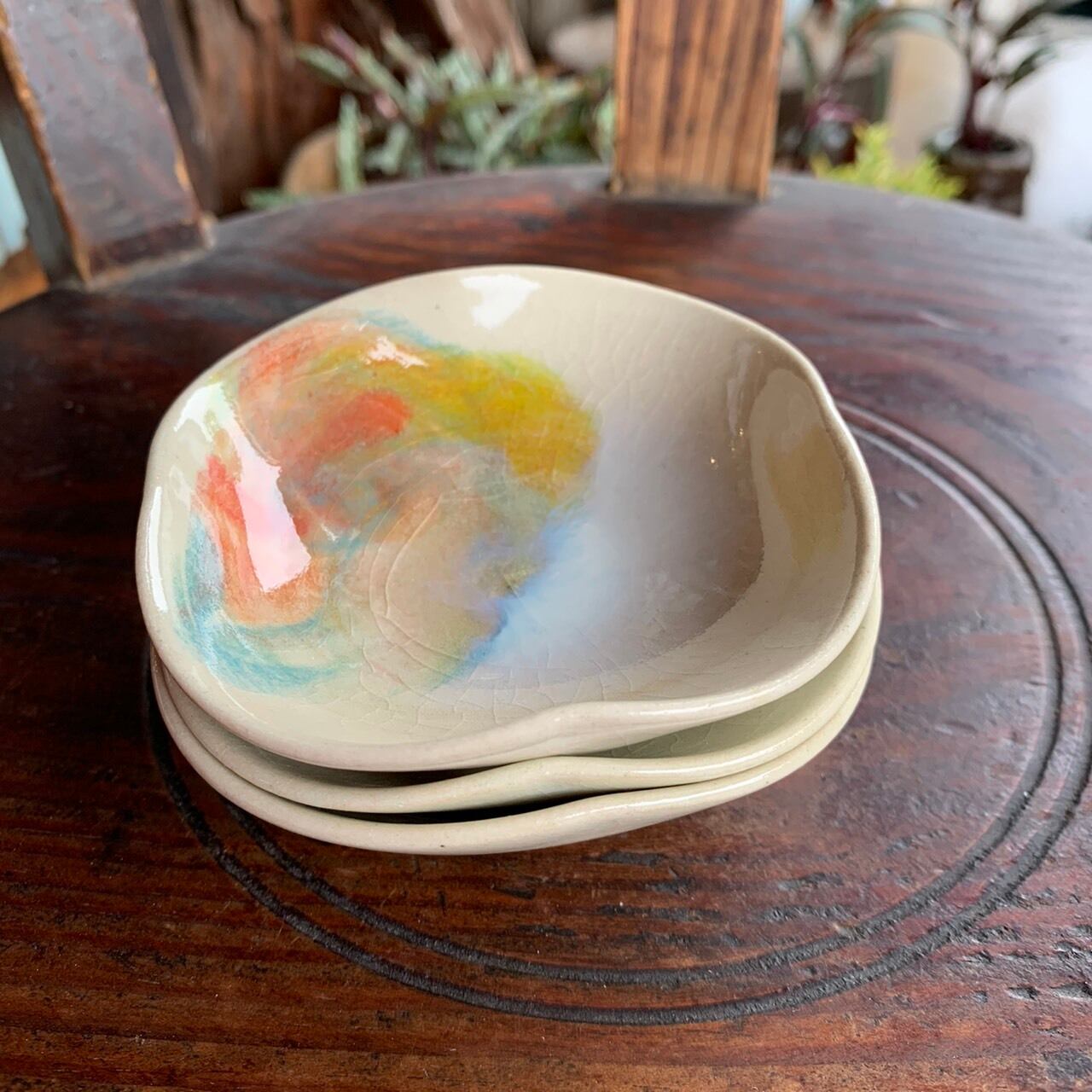 彩(いろどり)をテーマにしたシリーズの花小皿です。顔料で鮮やかな色をつけて、上から天然の灰を用いた透明釉薬をかけています。高台の釉溜まりも綺麗です。