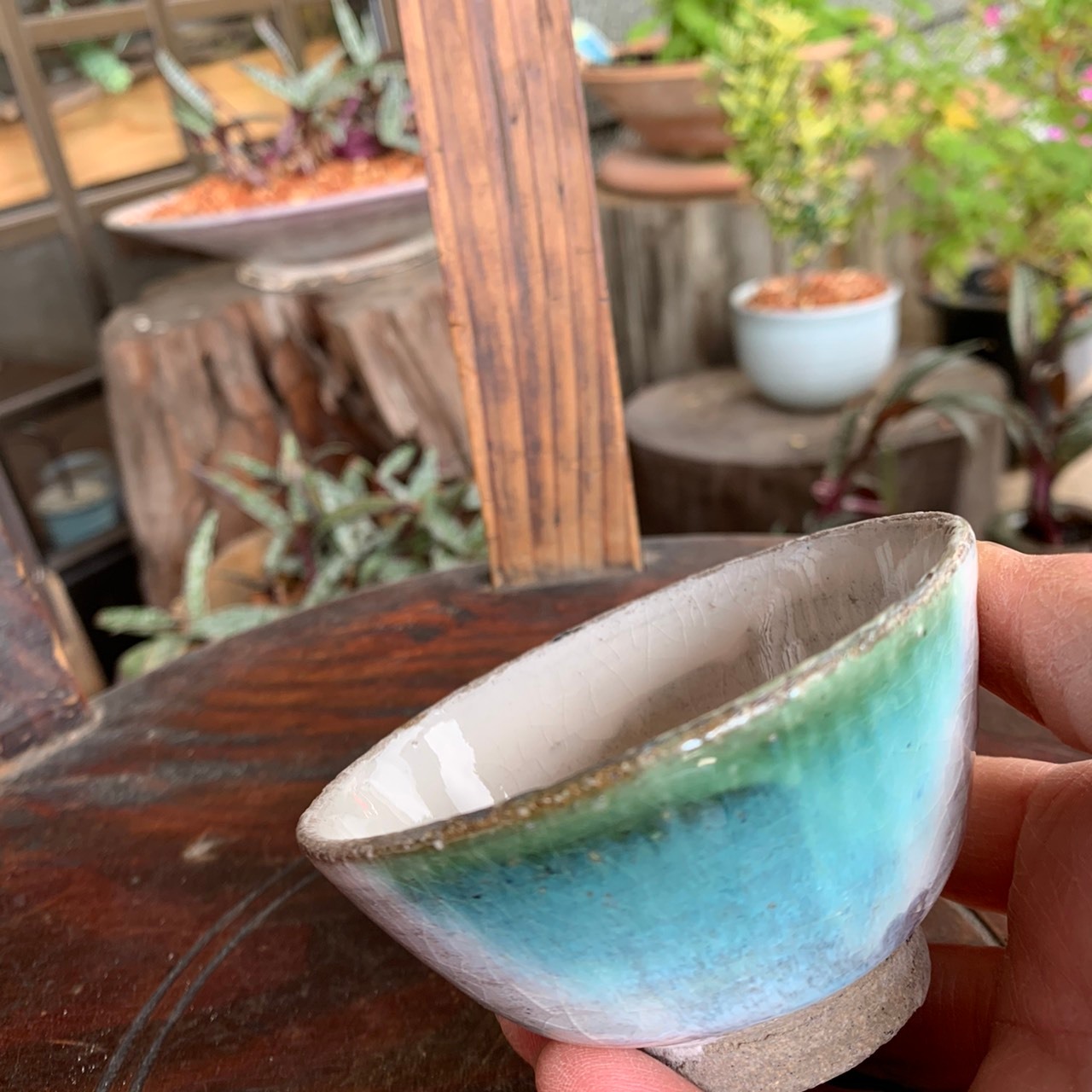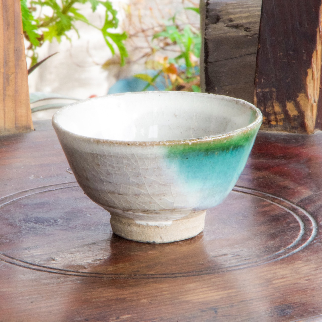 上野焼 伝統の釉薬「緑青(ろくしょう)」を、カオリンの白化粧の上からかけている ぐい呑です。しっかり入る大きさですが、薄作りで軽いため、お酒がするする進みます。電気窯での焼成で、緑青が綺麗に発色しています。