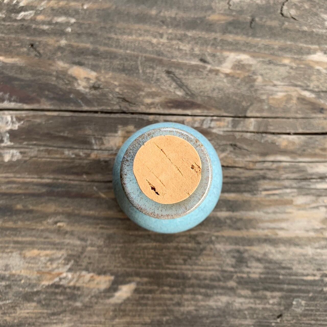 水色の陶器の小瓶です。もちろんコルクもおつけいたしますよ。内側が素焼きになっているので、乾燥調味料の入れ物などにお使いいただけます。
