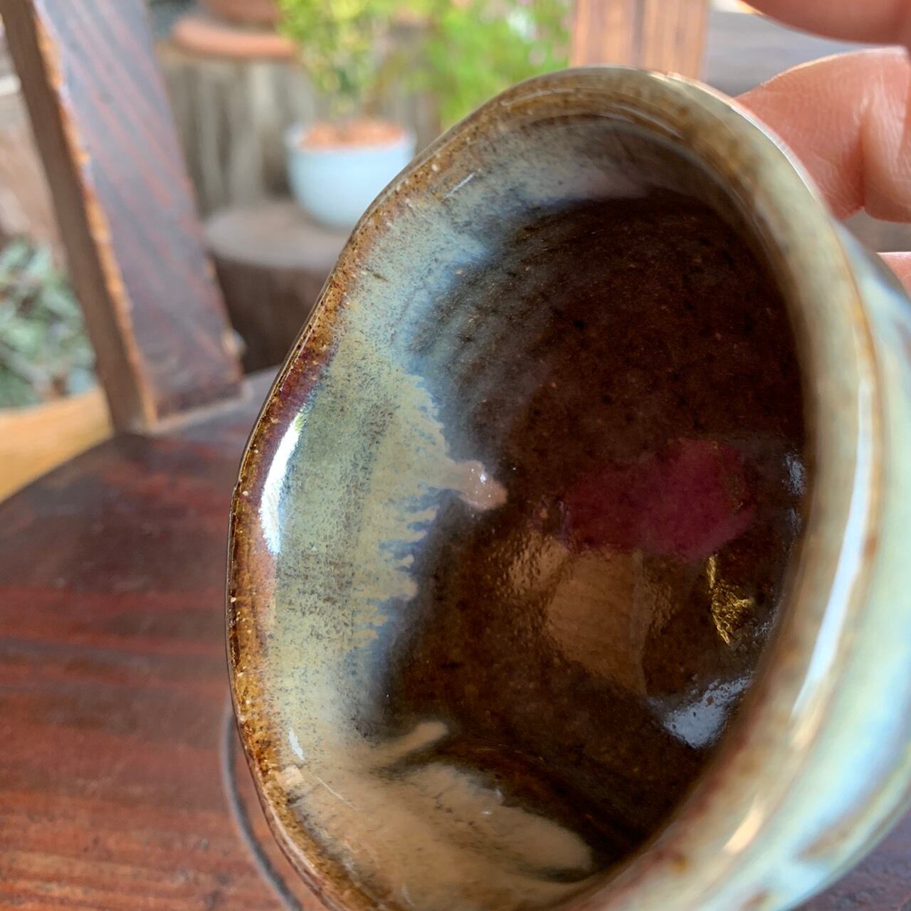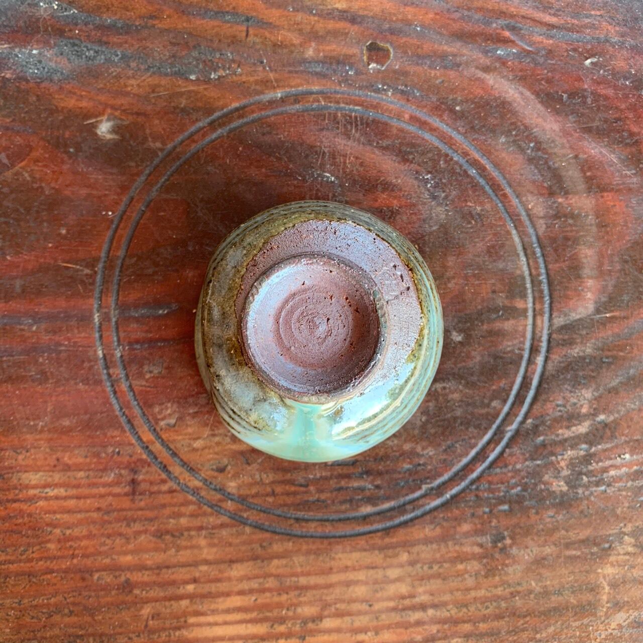 上野焼 伝統の釉薬「緑青(ろくしょう)」を、ワラ白釉の上からかけている ぐい呑です。無骨な雰囲気があり、大ぶりなのでお酒がよく入ります。薪窯で焼かれた器なので渋い発色になっております。