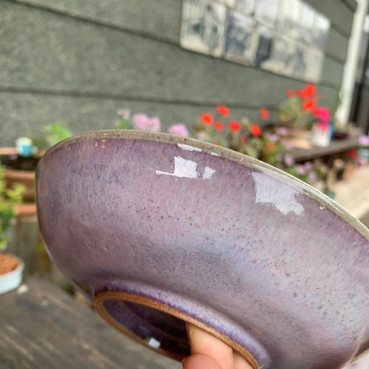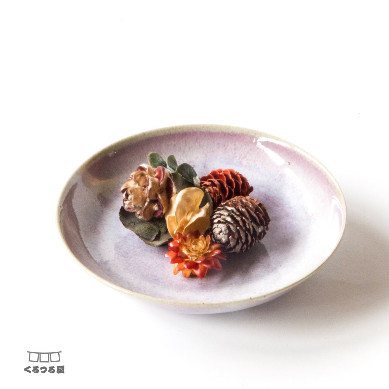 取り回しの良い大きさの丸皿です。庚申窯独特の藤色の釉薬は落ち着いた色合いの料理との相性が良く、一年を通してお使いいただけます。