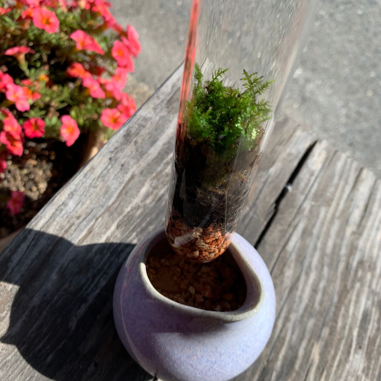 このシリンダー型のテラリウムには、レンガを砕いたかけらを一番下に、次に養土を入れて、一番上に庚申窯に自生している苔を置いています。