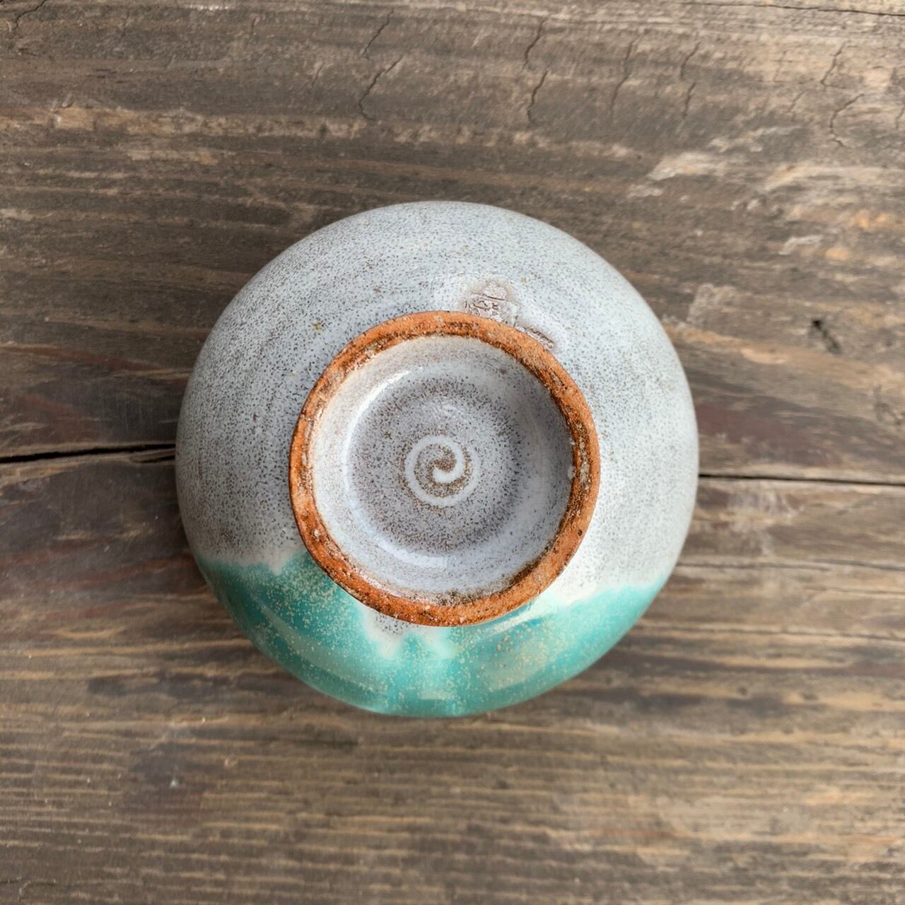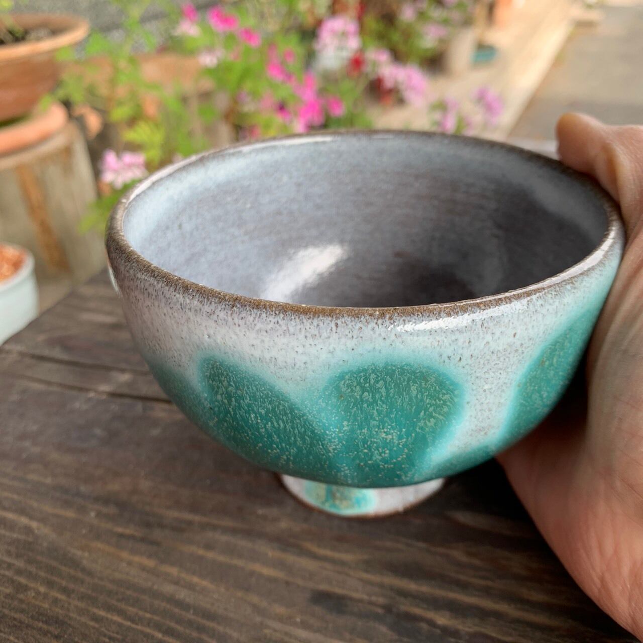 お稽古用の抹茶碗です。赤土で作った形に ワラ白釉を全体にかけて、正面に緑青を流した一品です。やや小ぶりで 軽い作りなので日常的にお抹茶を飲むのに向いていると思います。