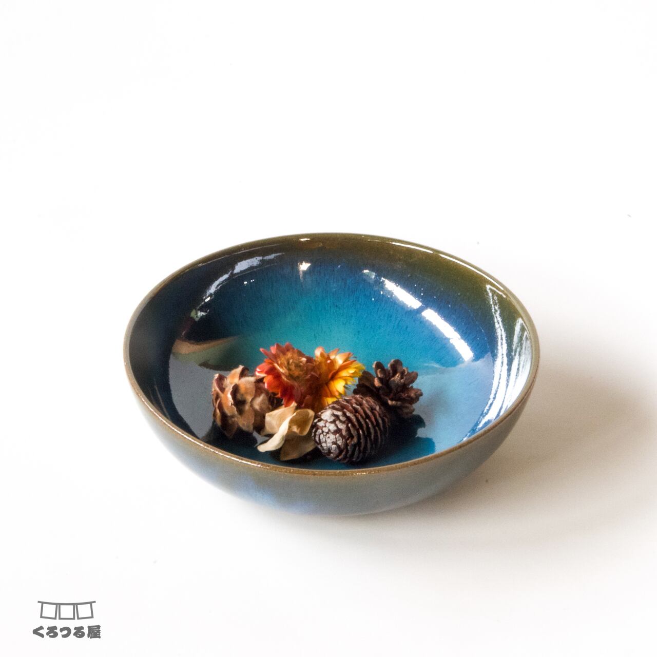 取り回しの良い大きさの丸鉢です。庚申窯の青い釉薬は、少し緑色もでているので、冷たい感じではなく、食卓にちょうどよい色合いです。暖かい色の食材と合わせると、青と緑が背景となって食材の色が引き立てられると思います。