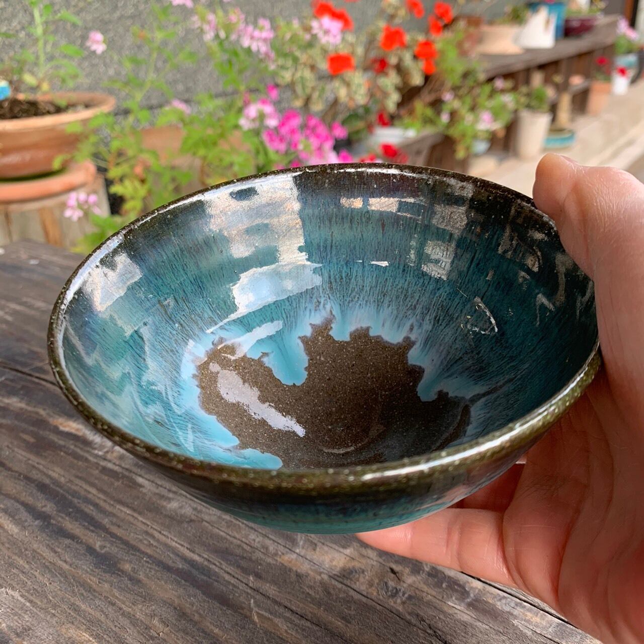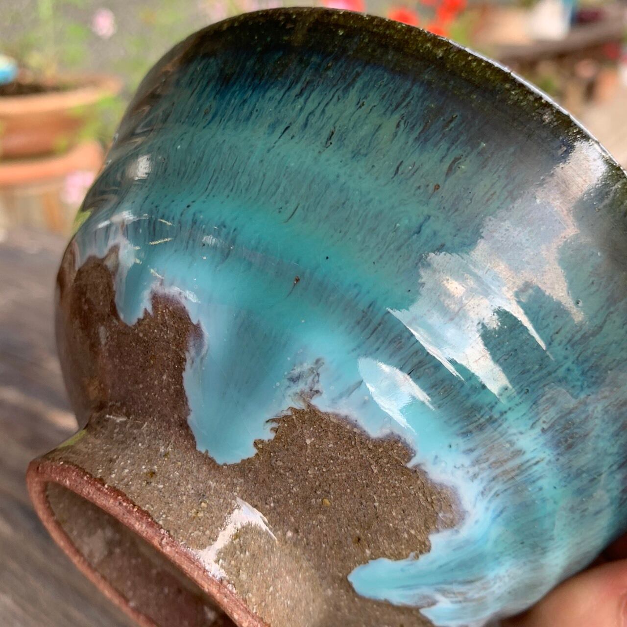 上野焼 伝統の釉薬 緑青流し(ろくしょうながし)のご飯茶碗です。