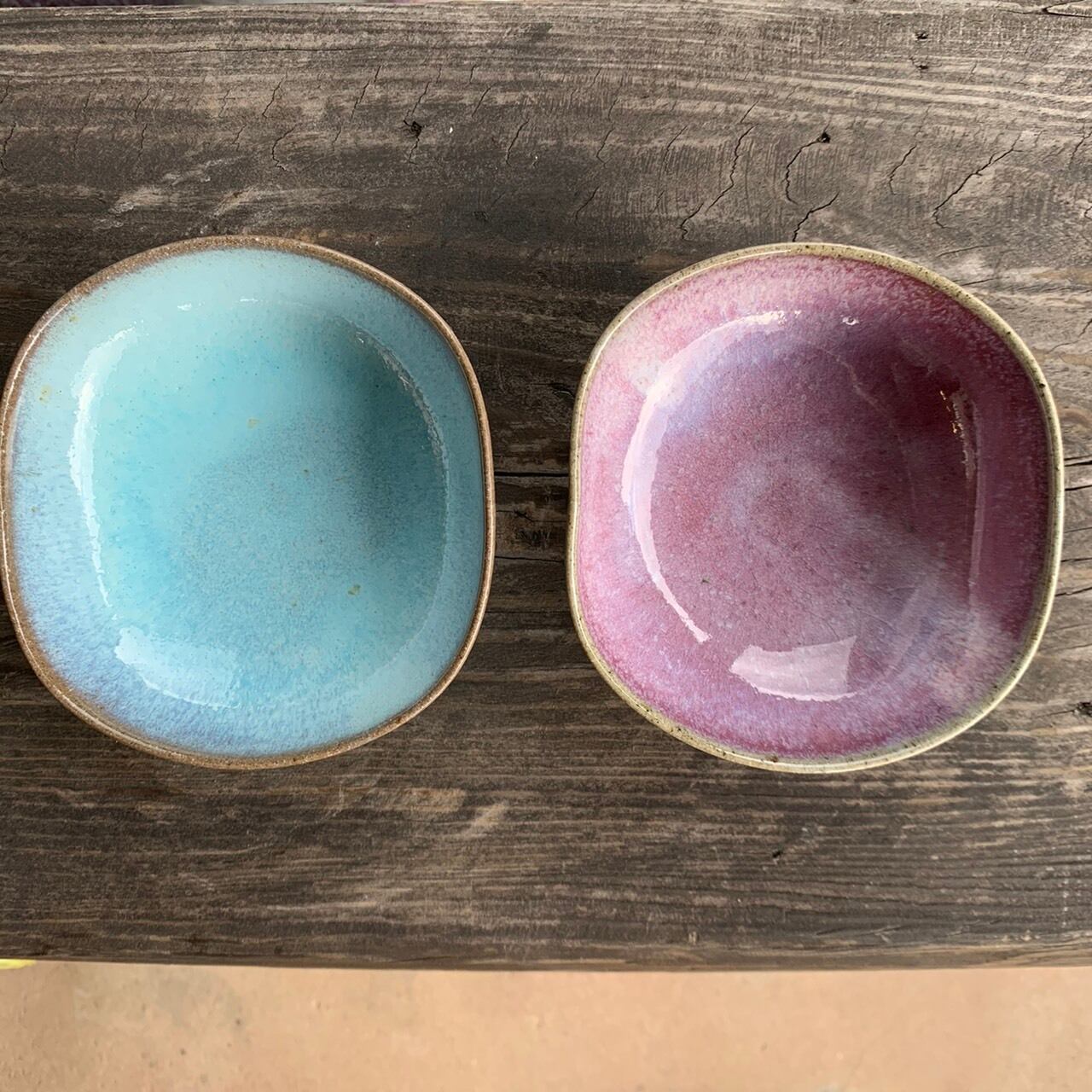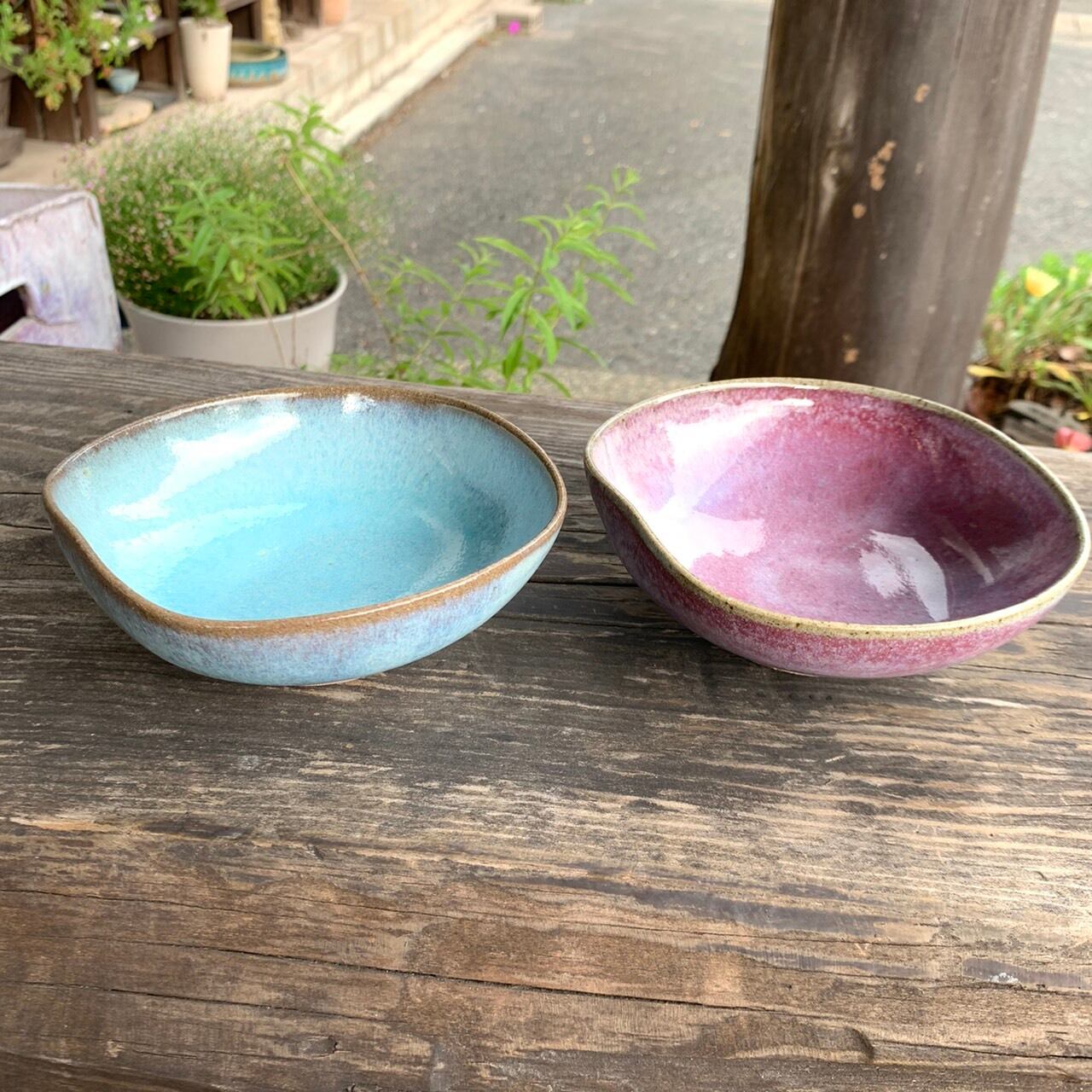 真ん中がちょっとくびれた形の、取り回しの良いピンクと水色の小鉢です。