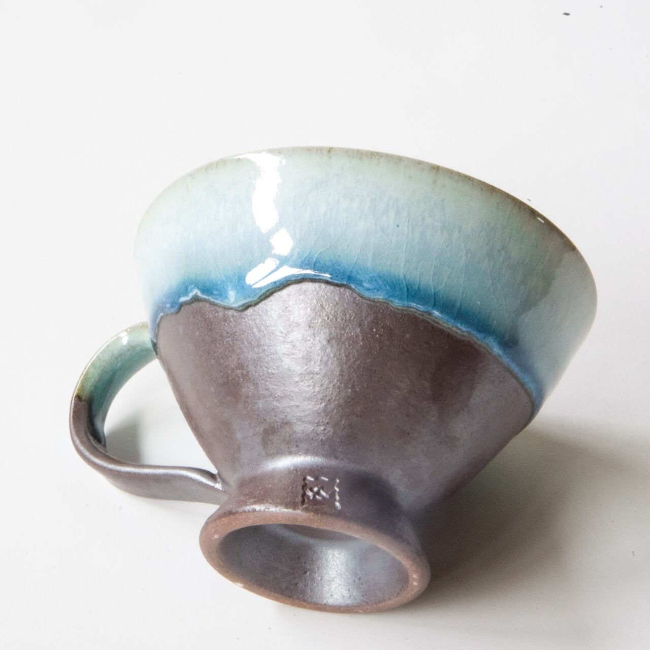 ボディはちょっとメタリックな黒で、内側と縁は わら白釉が還元された青白い色になっています。薄作りなため焼いた時に取手に引っ張られて少し歪んでいます。