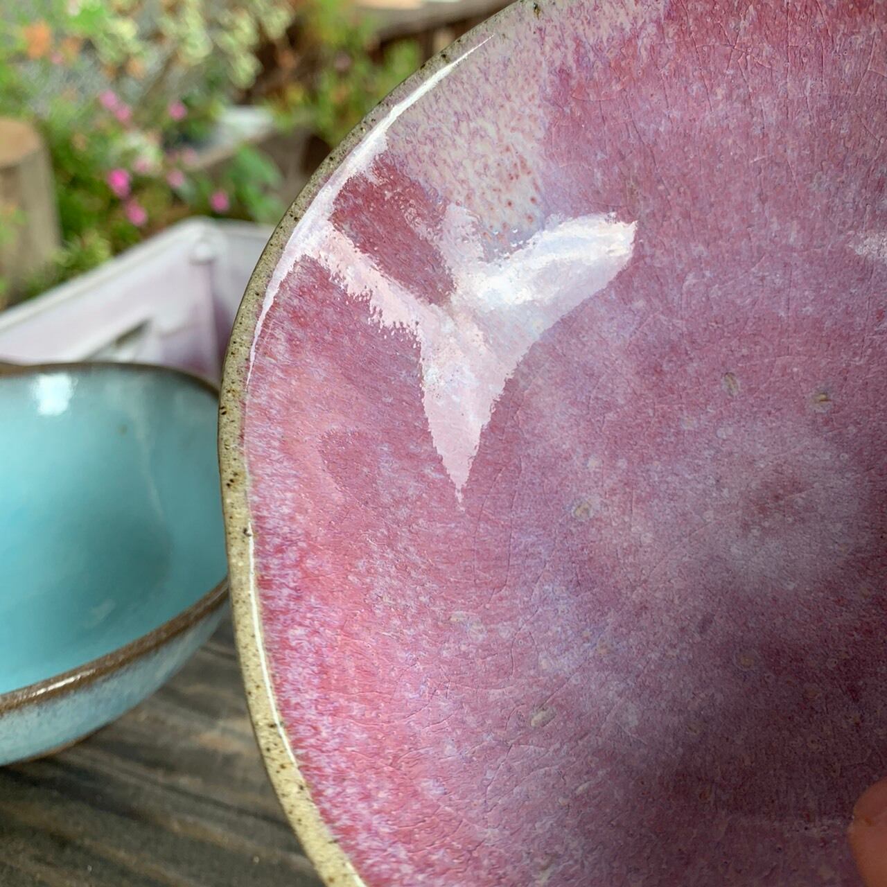 真ん中がちょっとくびれた形の、取り回しの良いピンクと水色の小鉢です。