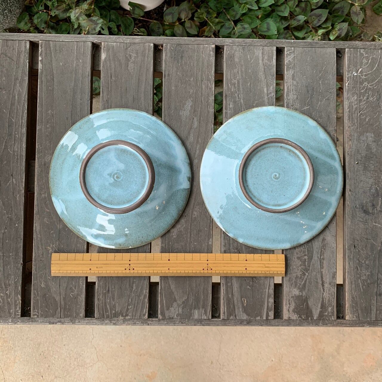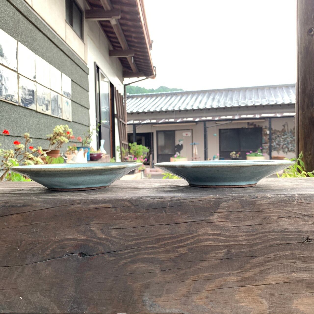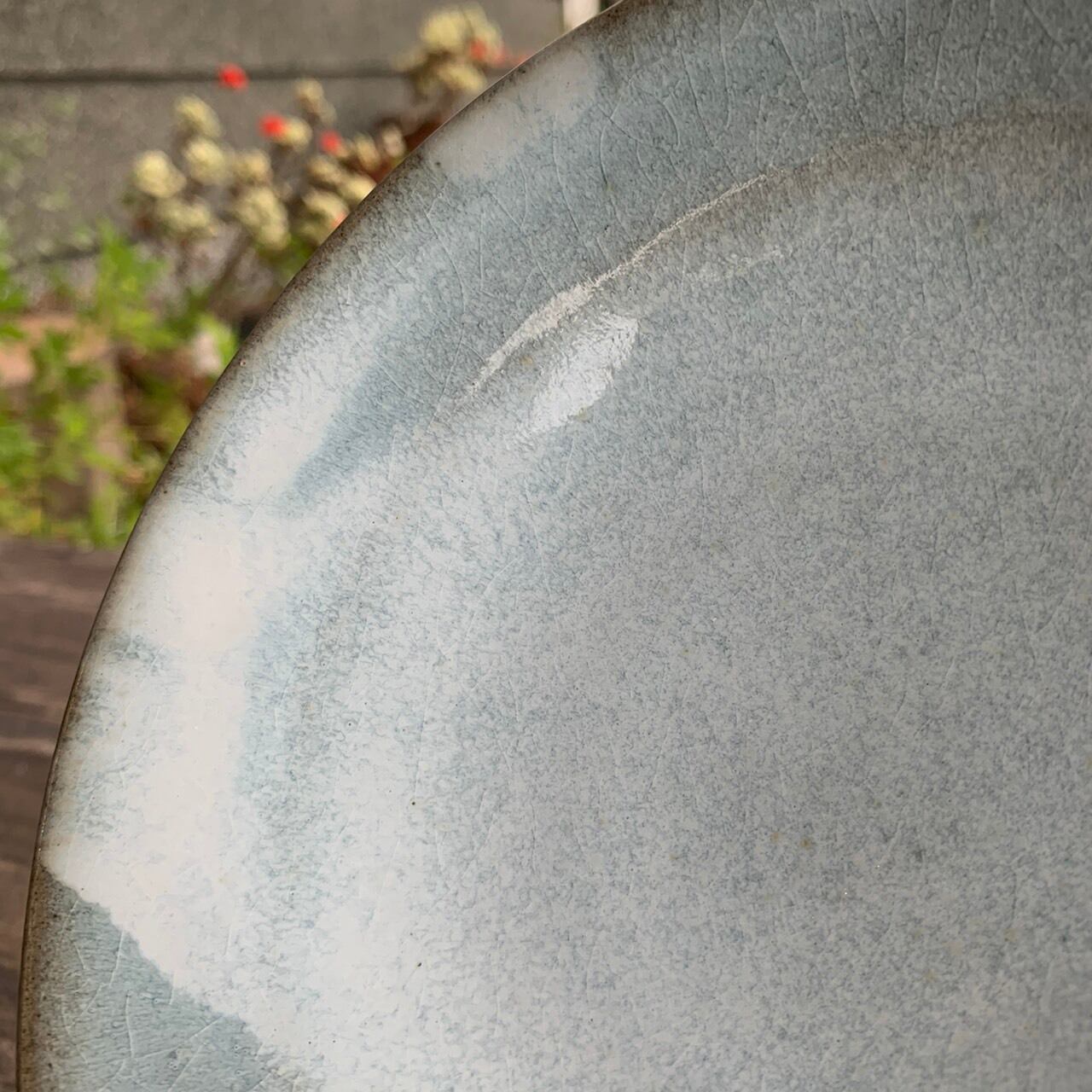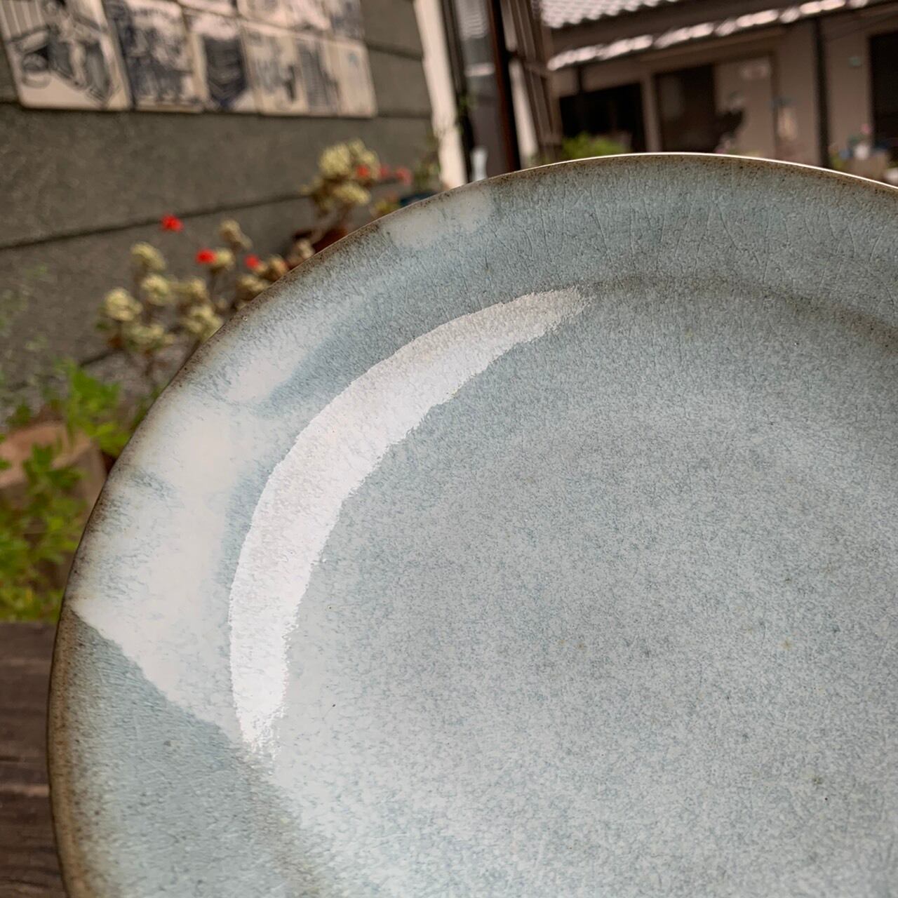 通常のリム皿は、料理を盛り付ける部分とリムとの境目にはっきり段差があるのですが、このお皿は途中から角度が変わっているだけっていう感じのリム皿でして、お皿の作りも真っ平らではなく、ゆるーくカーブを描いてフチが上がっています。柔らかい雰囲気を意識しました。