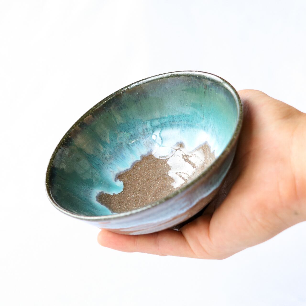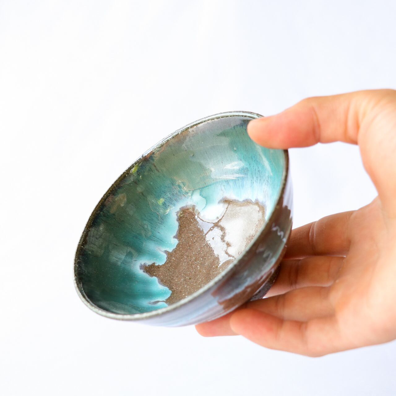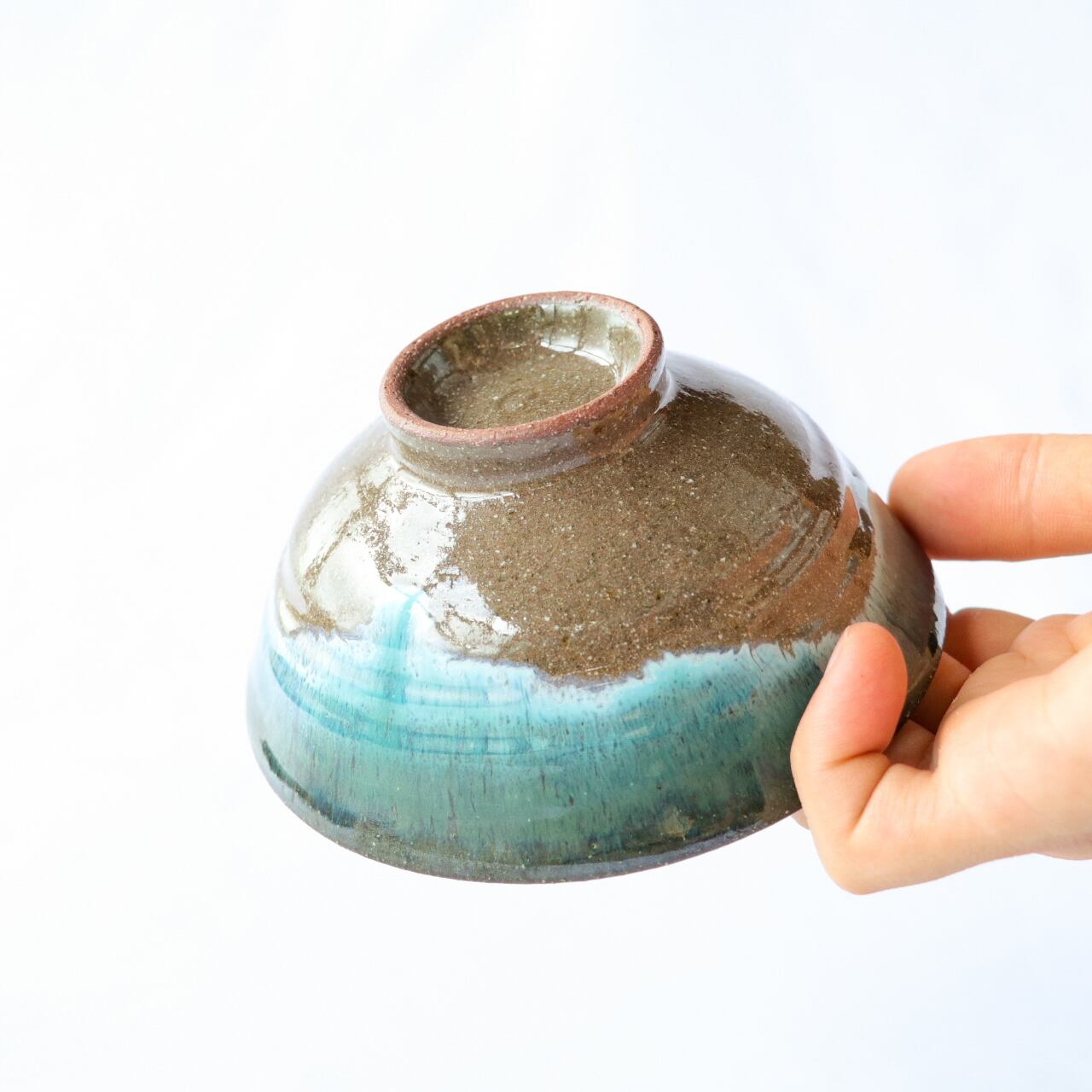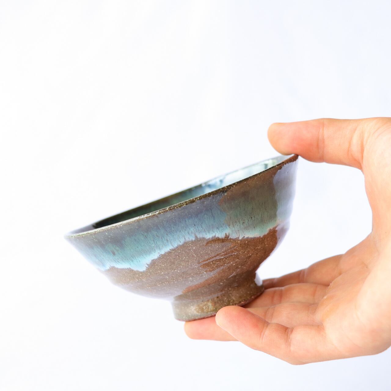 上野焼 伝統の釉薬 緑青流し(ろくしょうながし)のご飯茶碗です。