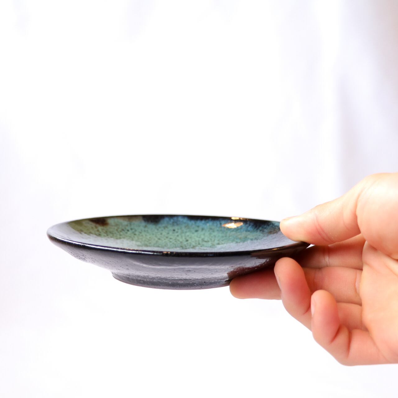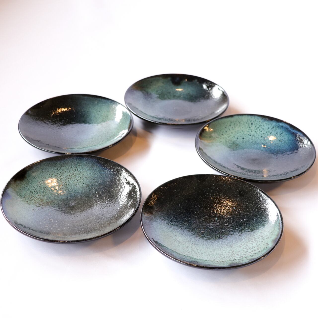惑星小皿とは違って 色は黒地に緑なのですが、この緑は あがの焼の代表的な釉薬「緑青(ろくしょう)」を使用したもので、黒地のところは黒の中に銀の結晶がたくさんできる父オリジナルの釉薬です。その黒の中の銀結晶が夜空に浮かぶ星みたいに見えますね。