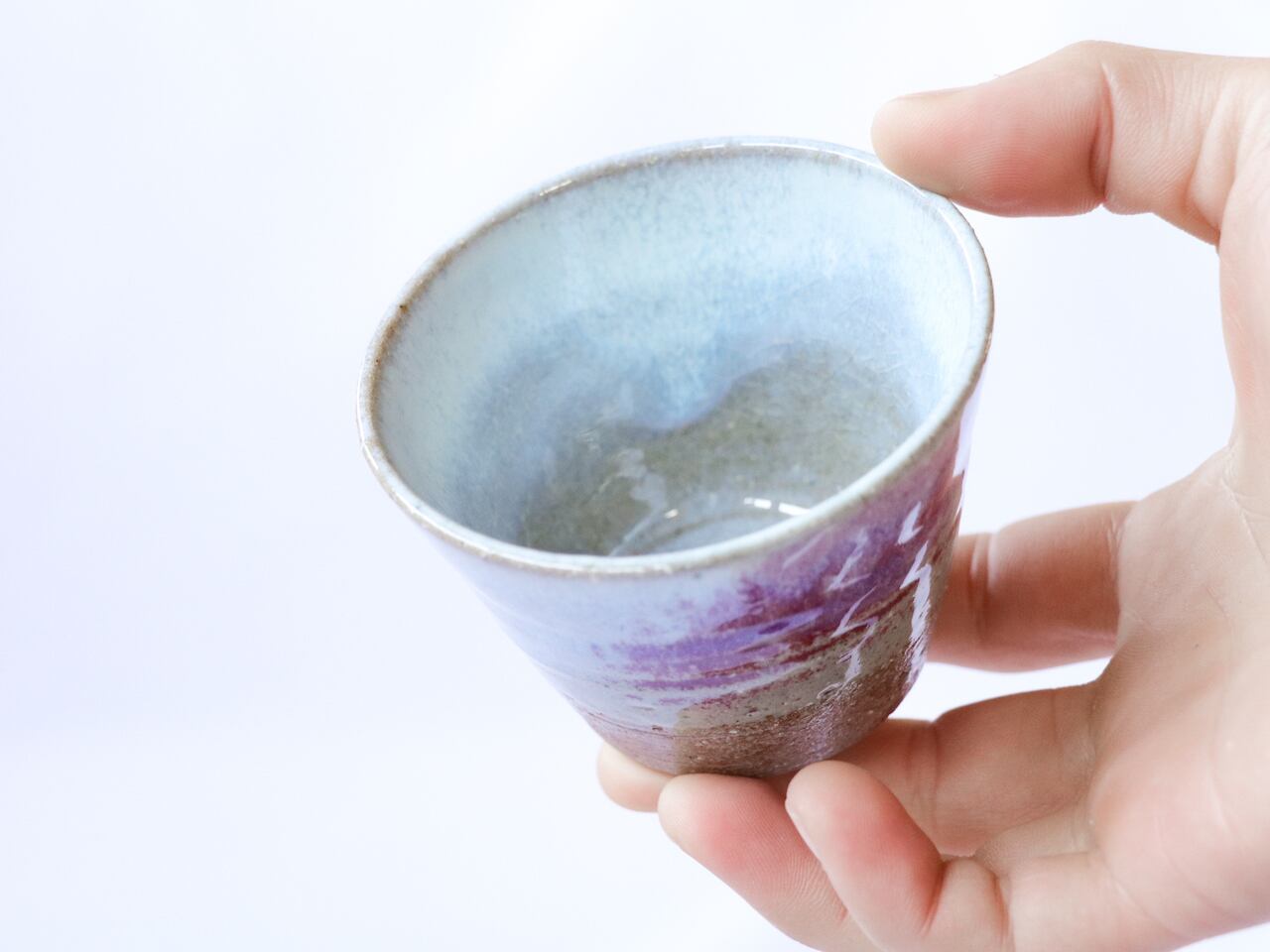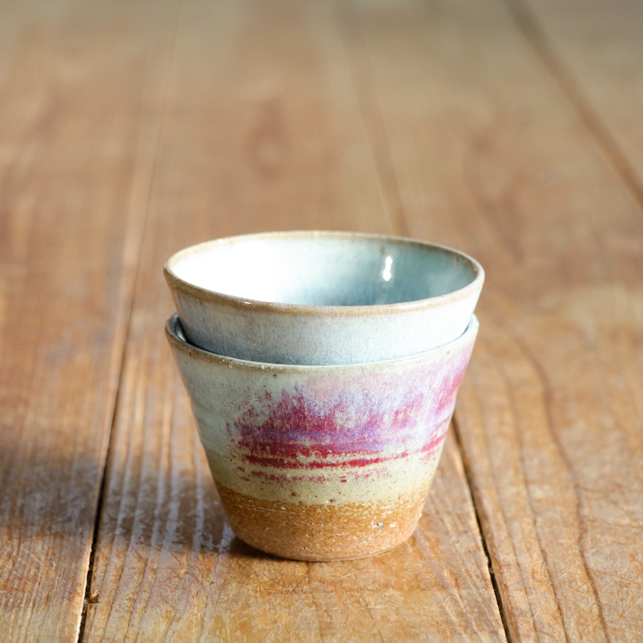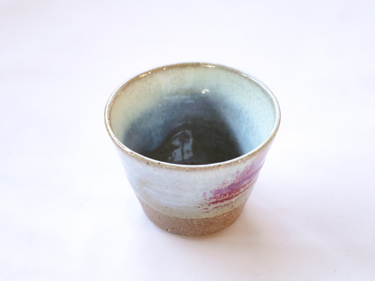 この釉薬はもともと辰砂(しんしゃ)という赤っぽい釉薬だったのですが、焼いた際に赤色を出す原料の銅が飛んでしまったみたいで、はんぶん以上白の器になったものです。色のついた釉薬はなかなか難しいのですが、それが楽しいところであもあります。