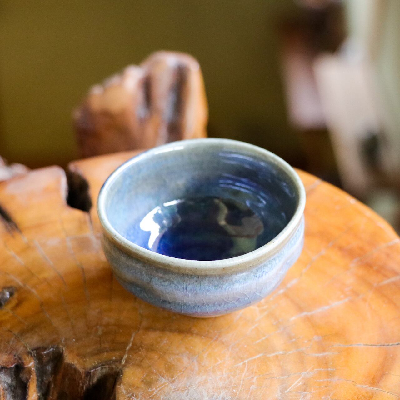 この色具合から推測すると、一度緑青(ろくしょう)系の釉薬をかけて還元で焼いたら釉薬が薄くて色が出てなかったので、上からコバルト系の釉薬をかけて酸化でもう一度焼いた って感じではないでしょうか。庚申窯で言うところの焼き直しというやつですね。