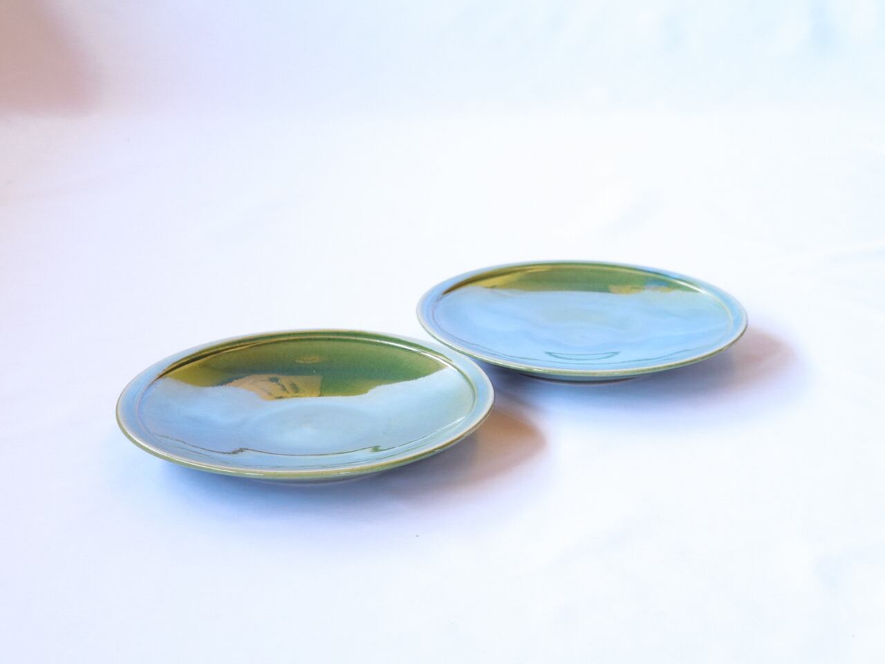 この色は庚申窯の「青織部(あおおりべ)」というやつを白土にうすがけして出る色で、釉薬の濃いところは青く、薄いところは草色のような色になっていますが、このくらいの色のことを「薄青(うすあお)」と言うそうです。昔は緑色を青って言ってましたものね。緑系統の釉薬は食材の色を引き立ててくれる色だと思います。