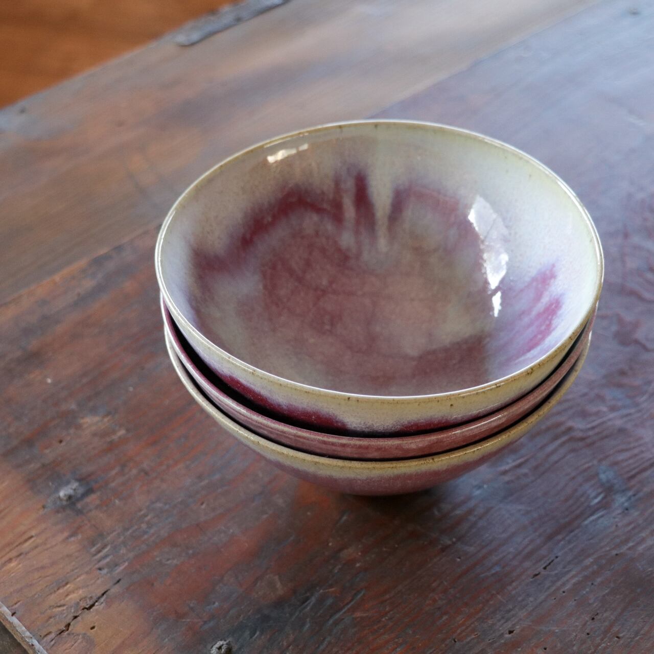 こちらは辰砂(しんしゃ)の丼です。庚申窯の辰砂はこんな感じの優しめカラーですね。この色は焼いている時の煙の具合とか火の当たり方とかですぐに変化するタイプの釉薬でして、そういうのを窯変(ようへん)と言ったりしますが、ABCでそれぞれ色の出方がかなり違っています。コントロールの難しい釉薬ですね。