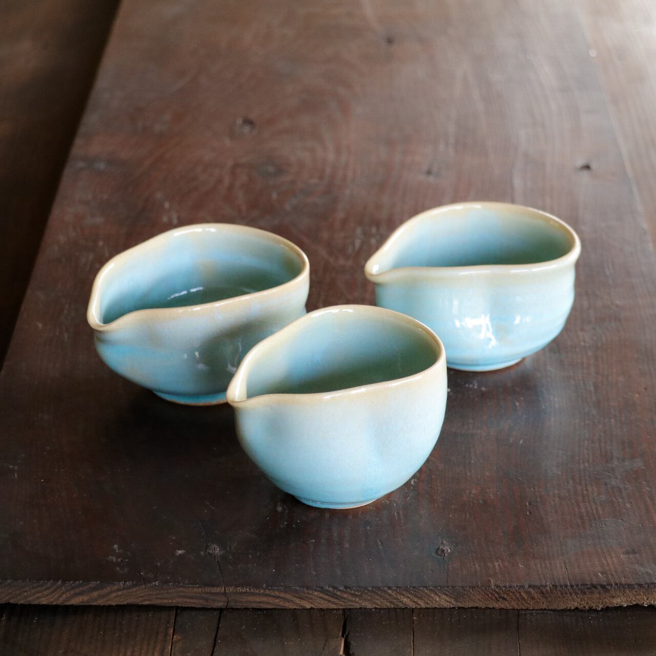 この片口に使われているのは「水縹(みはなだ)」という釉薬で、透明感のある爽やかな水色です。青系の釉薬は あがの焼の流れを汲むもので、こういう色合いが今では あがの焼の代表的なカラーになっていると思います。庚申窯でもよく作る色ですね。