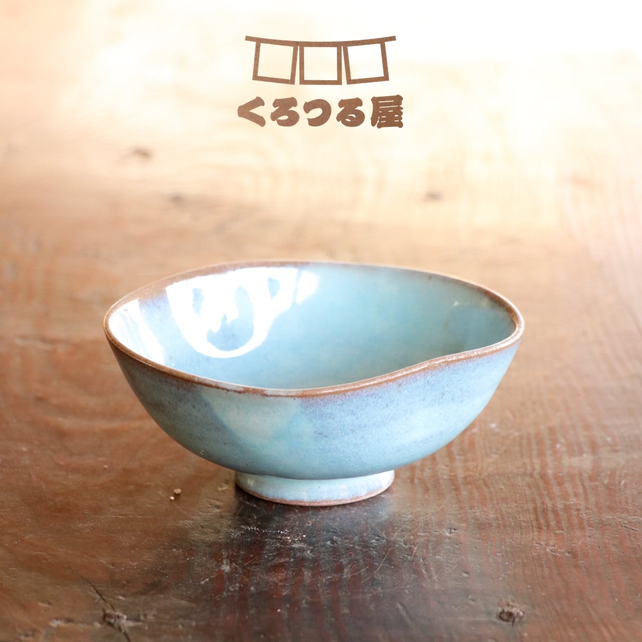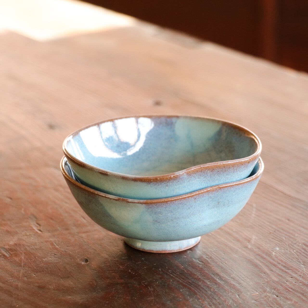 真ん中がちょっとくびれた形の小鉢です。おかずの一品や、取り皿などいろいろな用途に使える大きさですね。いつもは2色セットなんですけど水色の2つしかなかったので水色の2つセットです。釉薬は「水縹(みはなだ)」ですね。もしリクエストがあればお知らせください。この釉薬の色で〜 というメッセージをいただけましたら そのように作らせていただきます。父が。