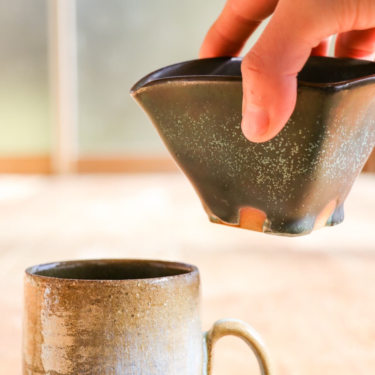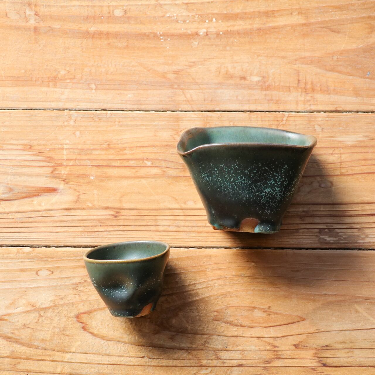 黒緑青(くろろくしょう)は一度焼き上げた緑青の器を、もう一度低温で焼き直すことで緑青の銅の成分だけに反応して黒くなったかっこいいやつのことです。