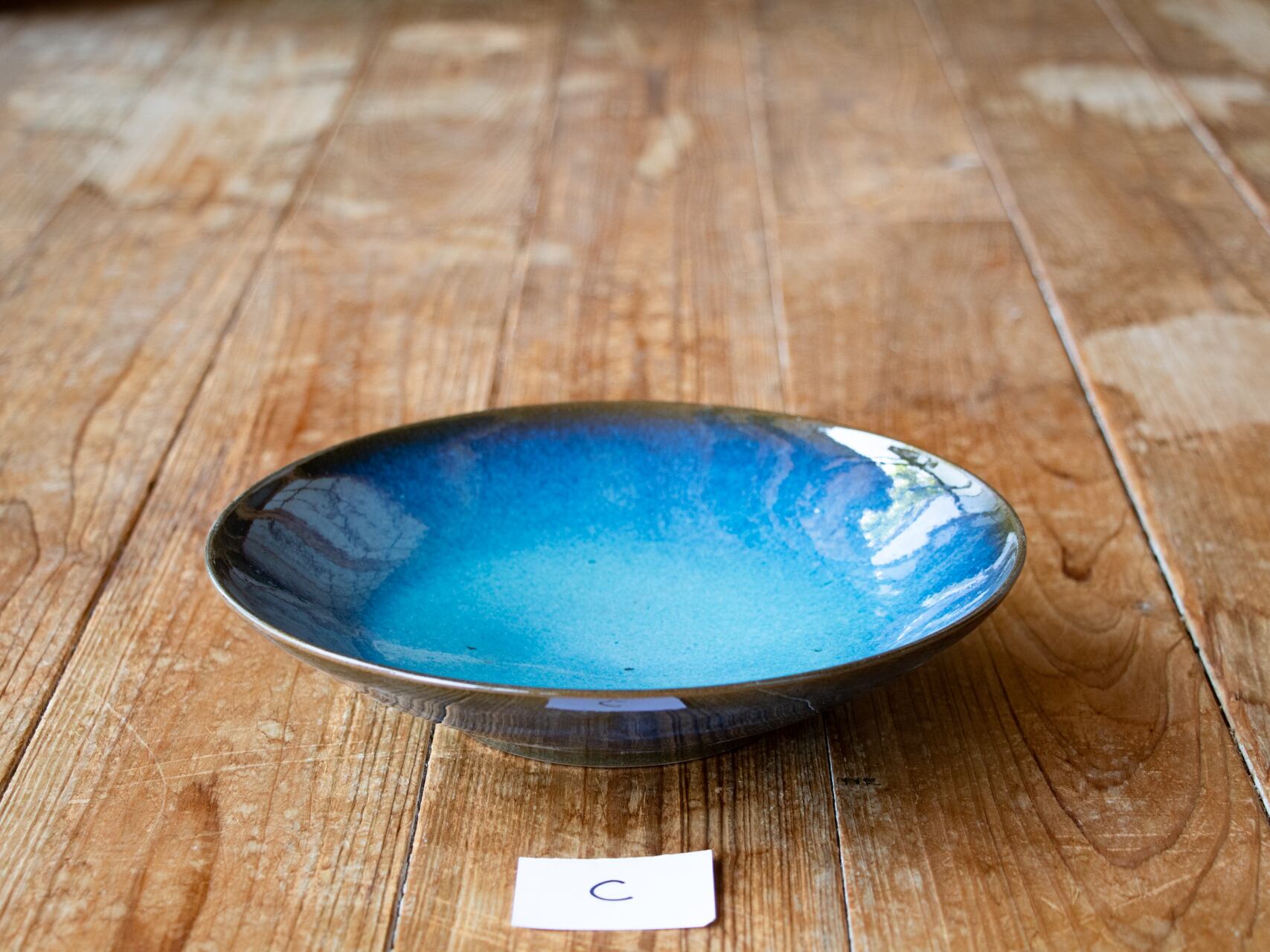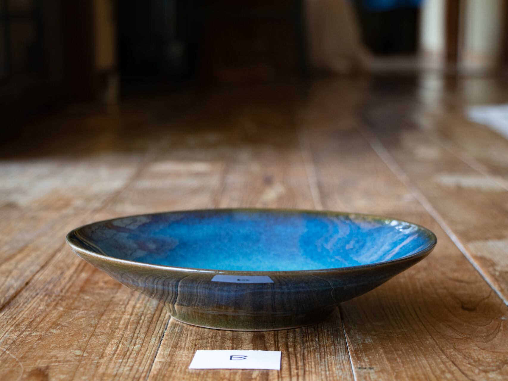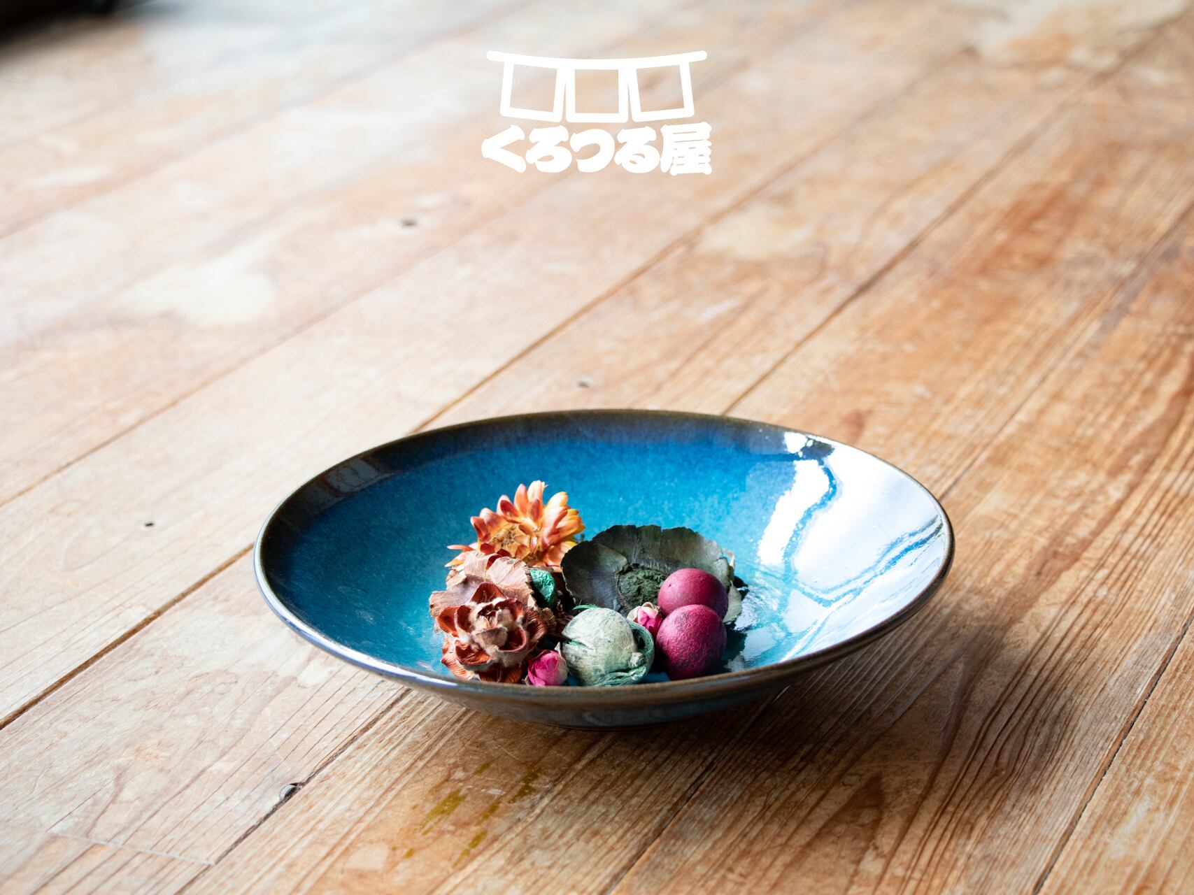 このお皿には青織部(あおおりべ)という釉薬を使っておりまして、青織部の青さは単に冷たい感じではなく 海の深い青さを持っています。