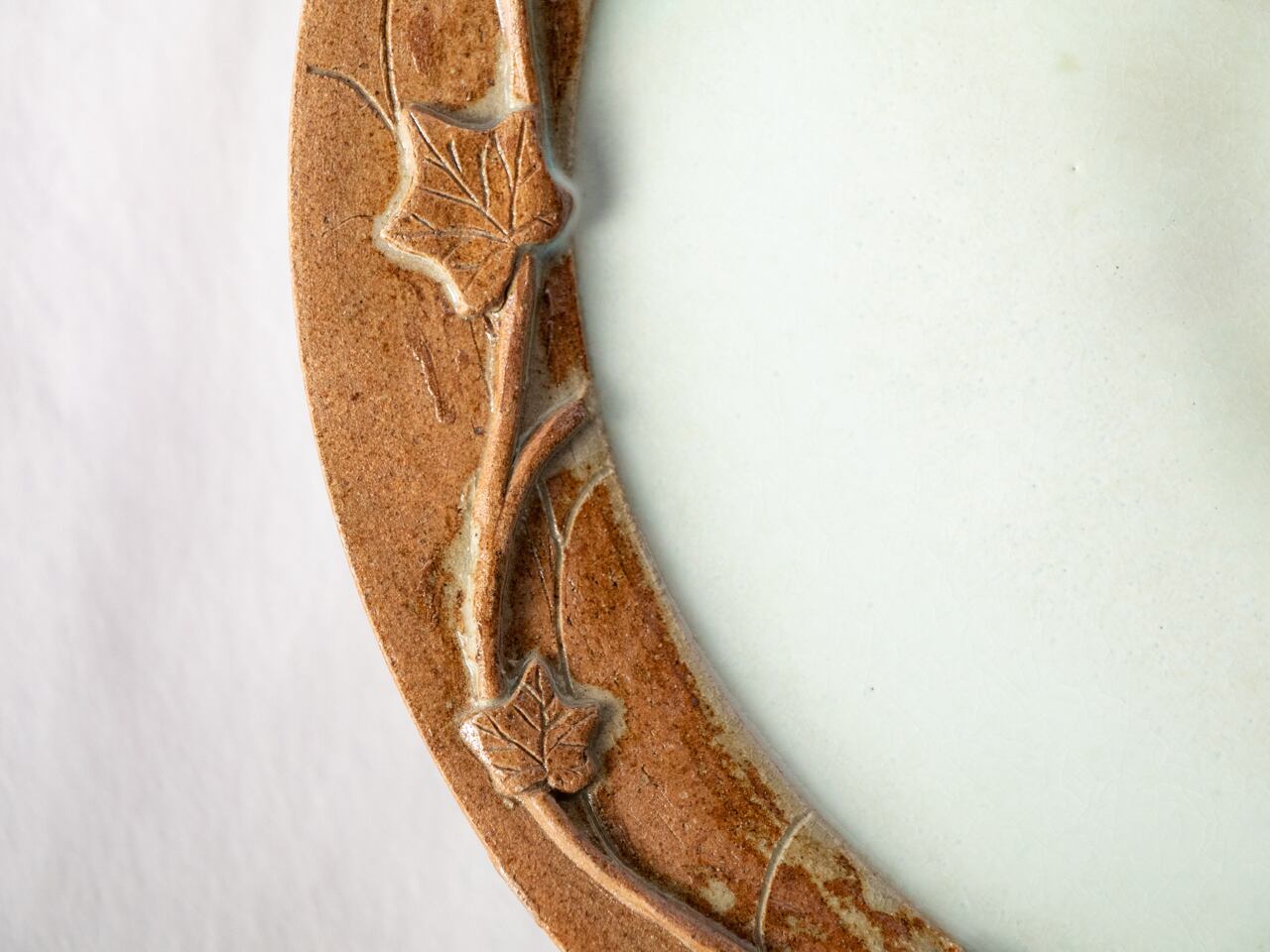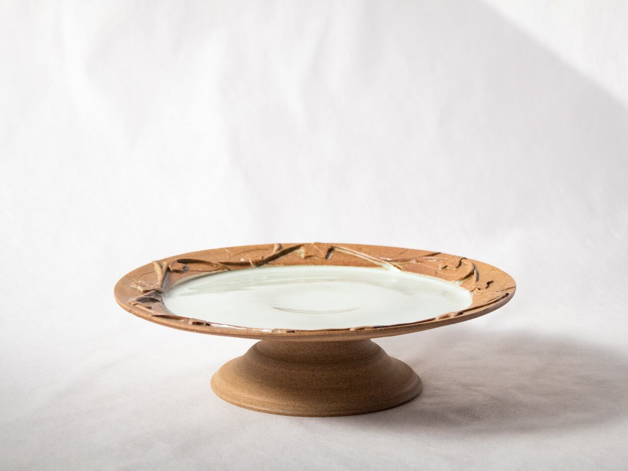 フチに貼花という技法でツルと蔦の葉を装飾したケーキスタンドです。
